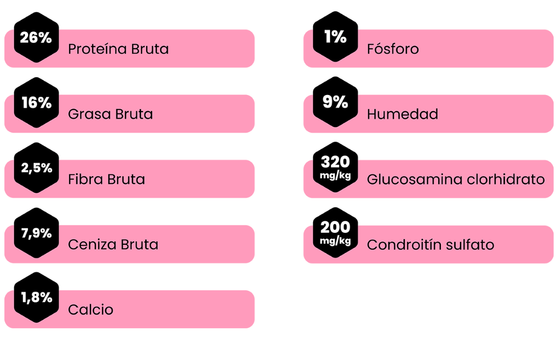 Carne deshidratada 36 % (pollo 14 %), arroz 27 % (arroz integral 15 %), guisantes 12 %, grasa de ave 12 %, harina de algarroba 2 %, pulpa de remolacha 2 %, proteína animal hidrolizada, vitaminas y minerales, levadura y extracto de levadura-Saccharomyces cerevisiae (fuente de mananooligosacáridos – MOS y β-glucanos), aceite de salmón (fuente de ácidos grasos omega-3), fibra dietética insoluble de guisante, inulina (fibra soluble de achicoria, fuente fosfooligosacáridos – FOS), salvia hispánica (fuente de ácidos grasos omega-3 y fibra dietética), algas (Ascophyllum nodosum), hidrolizado de crustáceos (fuente de glucosamina), hidrolizado de cartílago (fuente de Condroitina), aceites esenciales (orégano, canela, clavo, tomillo, romero, hierbabuena, té verde), yucca.
