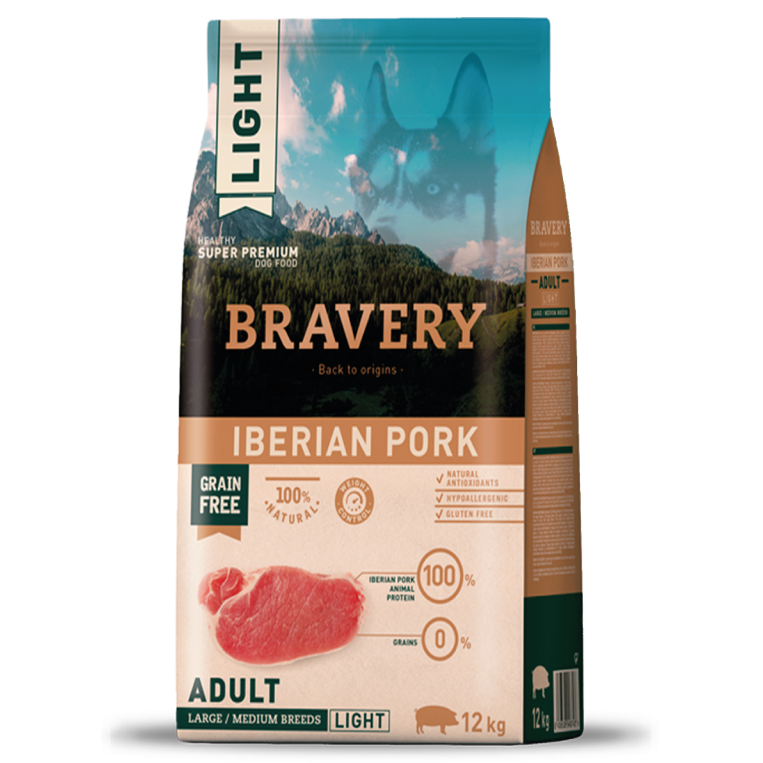 Bravery Light es alimento seco natural para perros de raza mediana y grande formulado con cerdo ibérico como primer ingrediente, deliciosa y digestible carne rica en vitaminas del complejo B y minerales como el hierro, zinc y potasio que ayudan a evitar el cansancio en esfuerzos prolongados y contribuyen al correcto funcionamiento de los músculos, balanceado con un menor contenido calórico ideal para favorecer la perdida de peso de tu compañero de aventuras.
